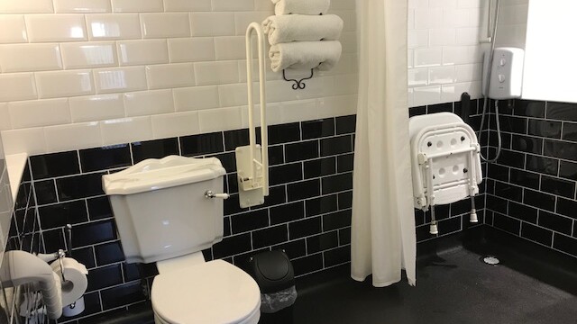 - Wet room with shower with chair, toilet with grab rails and hand basin.