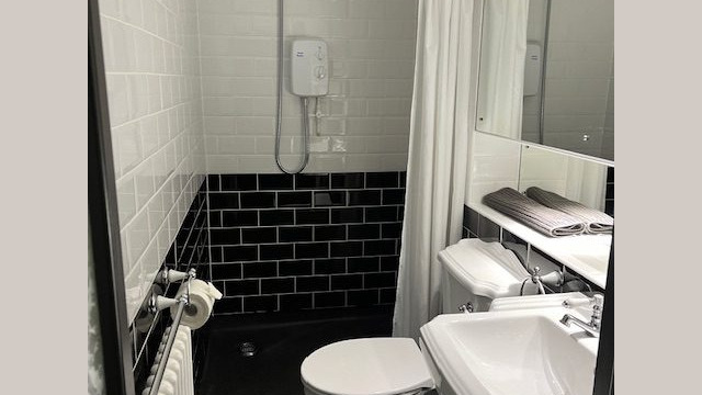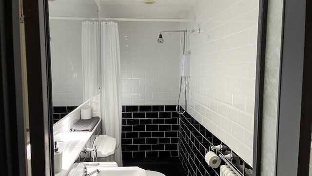 - Toilet and hand basin in a wet floor shower room.